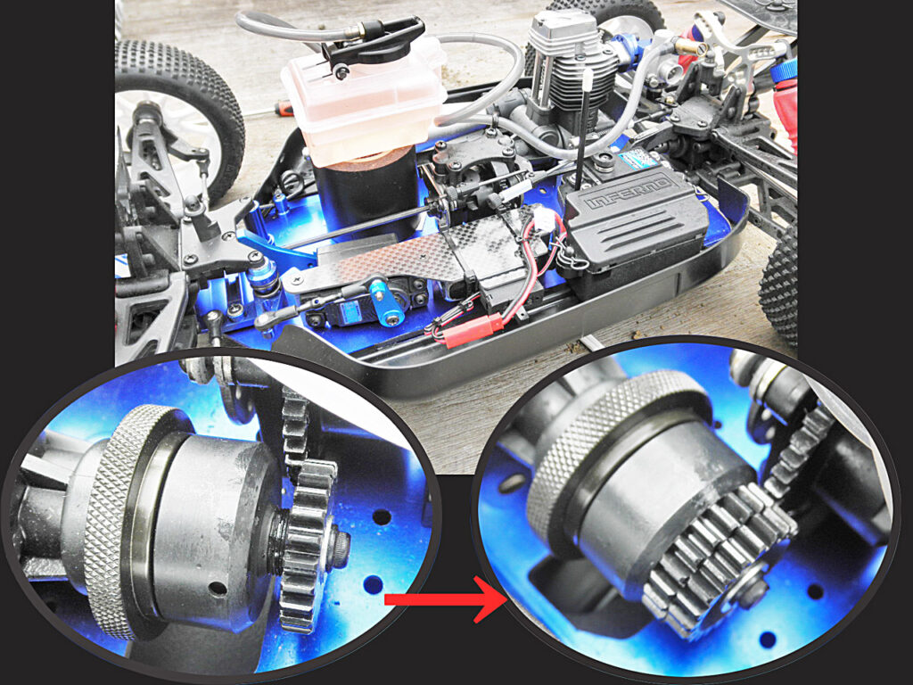 が・・・エンジン、掛かりません!?どーも4stの慣らしって上手く行かないんですけど。エンジンの吹き返しが強くて燃料を吸い込まないので、タンクを持ち上げてみたり。一瞬点火してる?ものの回りません。ニードル位置を色々変えてみたりチューブの長さを変えてみたりしますがダメです・・・。(例の、サイレンサーのニップル詰まりも確認しました)あと、どうもピニオンがすぐに緩んでしまうのでロックナット代わりに22tのピニオンを重ねて対策します。
