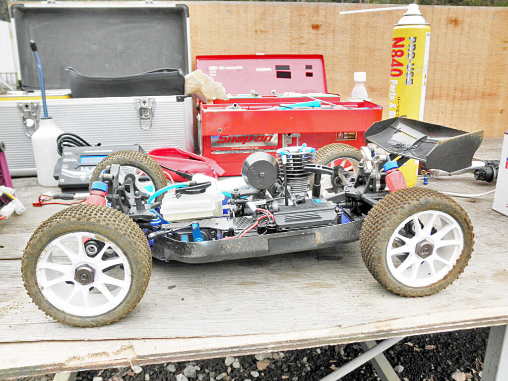 ニードル1回転半ぐらいが良さそうなので、そのままガンガン走らせます。2連ジャンプの踏み切りに失敗して二つ目のスロープに何度も激突したり、斜めに進入した大ジャンプの着地で転がりまくったり。それでもこの車、思っていたより全然頑丈です。Fショックのボールエンドが1回外れただけ。このサーキットではほとんど全開に出来ないので燃費もイイっす♪燃料5タンク分を使いきったところで本日は終了。