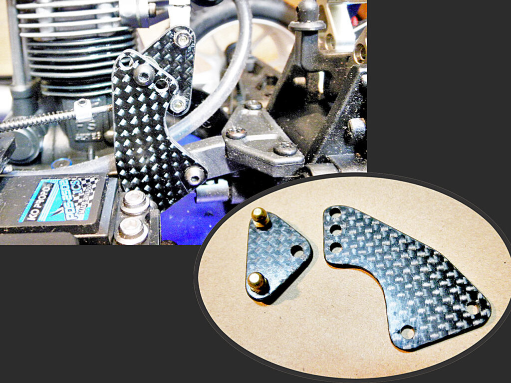 このままでは何も変わらないので、吸気系のレイアウトを変更してみます。直角キャブアダプターをやめてO,S,標準のストレートマニホールドに交換します。リンケージの取り回しも変更しますが、スロットルレバーの向きが変わったので面倒な事に。途中にカーボン板から切り出したクランクを追加。こんな感じで、リンクの動きを前後方向から垂直方向に変換します。この仕様で次のエンジン始動の機会を待ちます。