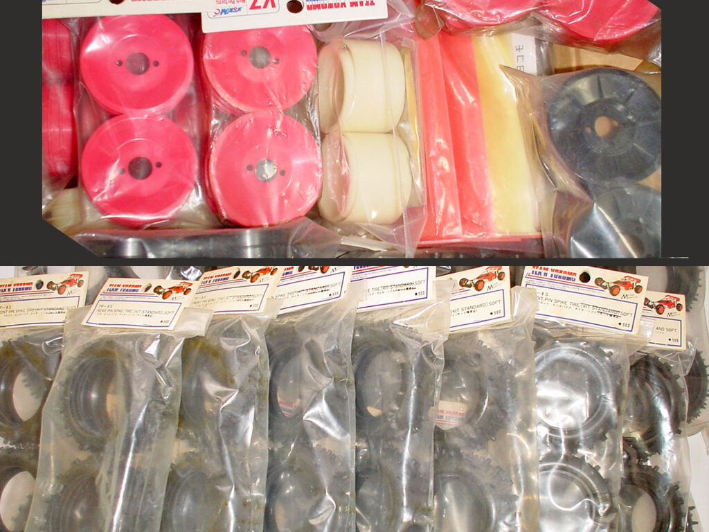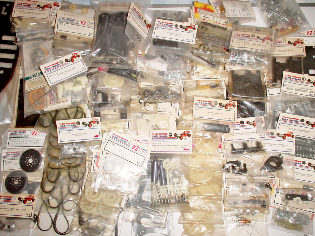 タイヤ・ホイールも再度の草レースを夢見てコツコツ集めてました。 20年前のドッグファイトをもう一度♪♪。 スーパードッグの足回りはマグネシウムのピボットが少々不安ながら、割と丈夫だったのでハブを交換して現行タイヤ履かせてもいいでしょう。 ところで何軒かの模型店のネット通販リストに、いまだにSドッグ系の「ZC」コードのパーツがあります。 このあいだ(09春)ダメもとで注文したらサスアームやシャーシ、タイヤ・ホイールを大量GET出来ました♪。