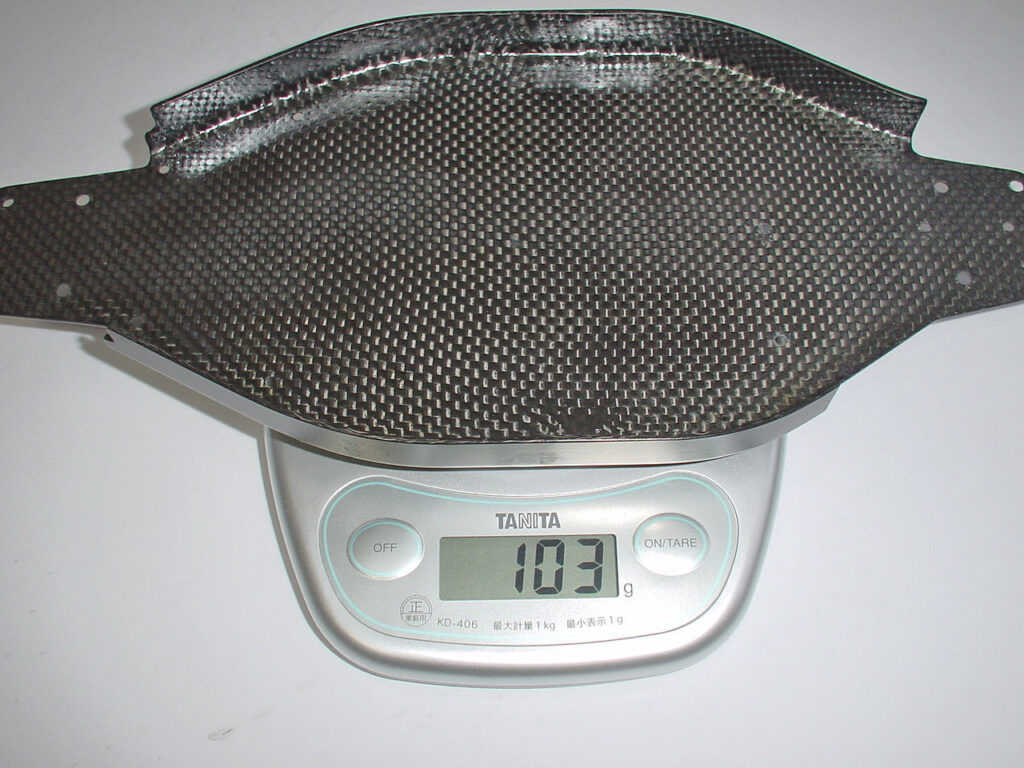 形状は、成型しやすいようにカドを無くして左右対称に。 オリジナルのボディーも搭載できます。 バッテリースロットを切り抜こうと思ってましたが、強度的に微妙なのでやってません。 この状態で重量は103g。 標準のFRP製が145gなのでまあまあでしょう。