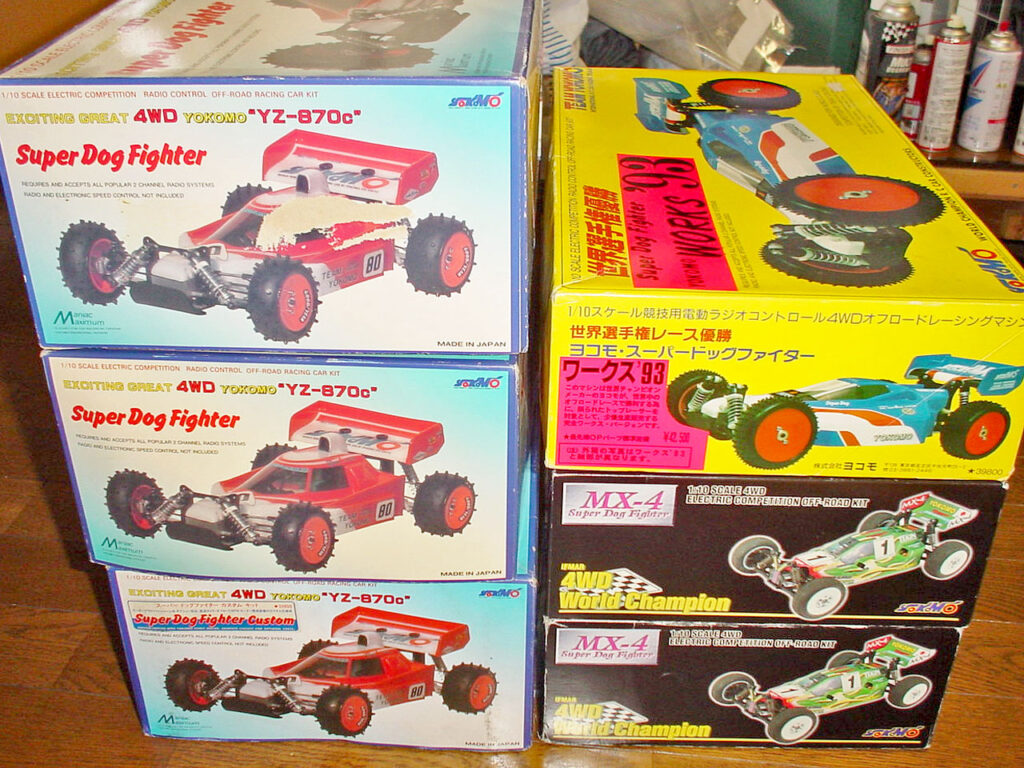 最初にSONY製品を買うと、メモリースティック使い回したいからSONYばっかりになっちゃう、みたいな流れでワタシのヨコモ(アソシ)漬けが始まったのがこのキットからです。 スーパードッグ系~YR系まで、実に多くの共通部品がありました。 (ヨコモ⇔アソシもインチサイズの汎用パーツ等の共用が多い) コレはスペア&部品取り用に購入したものの、いまさら組むのがもったいなくなって死蔵(笑)されてるドッグ系とMX-4です。