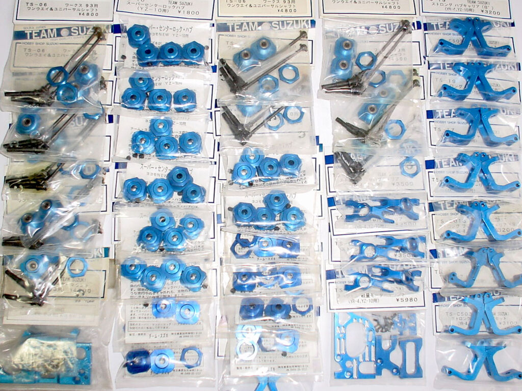 ヨコモキットが増えていく中、スペア用にと見つける度に買っていたらいつの間にかこんなに・・・。 「チームスズキ」のドッグ系用のパーツです。 このブランドはそのむかし、バギーチャンプやRC10用の「MIPワイヤードライブ4WDキット」を輸入販売してた頃からのファンです。 (当時マニアックな輸入品はコンバージョンキットだけで59,800円!とか、凄い事になってました) 今ではヨコモ純正オプションにもなってるので皆さんご存知でしょう。