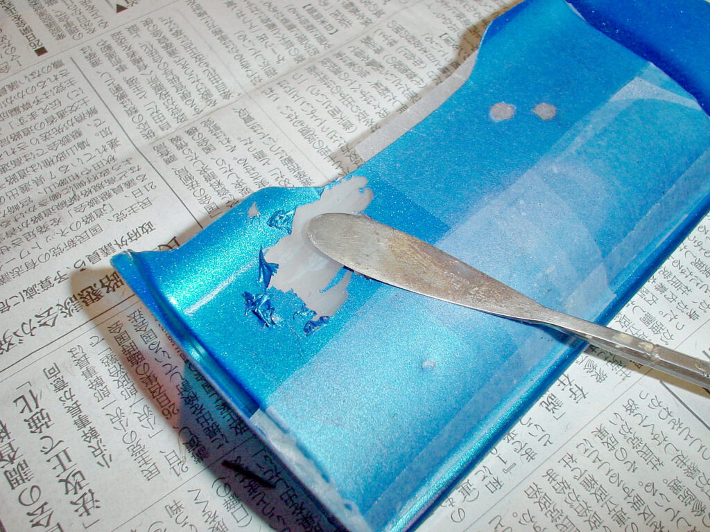 続いてボディーを準備します。 ワタシはオリジナルの「ちょんマゲ」が好きなんです が、キット以外の手持ちが無いので中古の「プロテック4」を塗り直して使います。 まずは古い塗膜の剥離から始めます。 最近出回ってるマルクの剥離剤「とれるやん!!」 (笑)を使ってみます。 能書きが本当なら凄いんですが・・・。