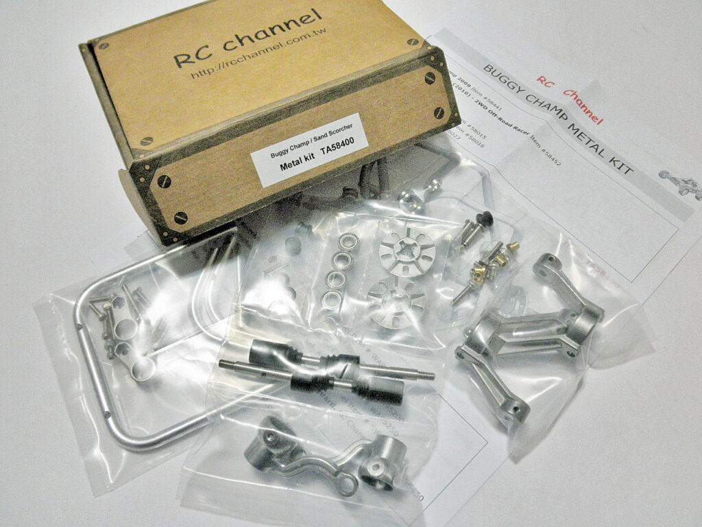 こんなモノを衝動買いしてしまいました。(たぶん)台湾の「RC channel」製、リアサス用ダブルウィッシュボーン(!)変身キット。ネットでチャンプ/ワーオフ関連のパーツを探してたら偶然見付けました。メーカーH/Pのカタログ価格は100ドル。それをオークションで9,900円で購入。包装や取り説もちゃんとしてます。ボールデフ化でバラしたついでに早速組んでみます。