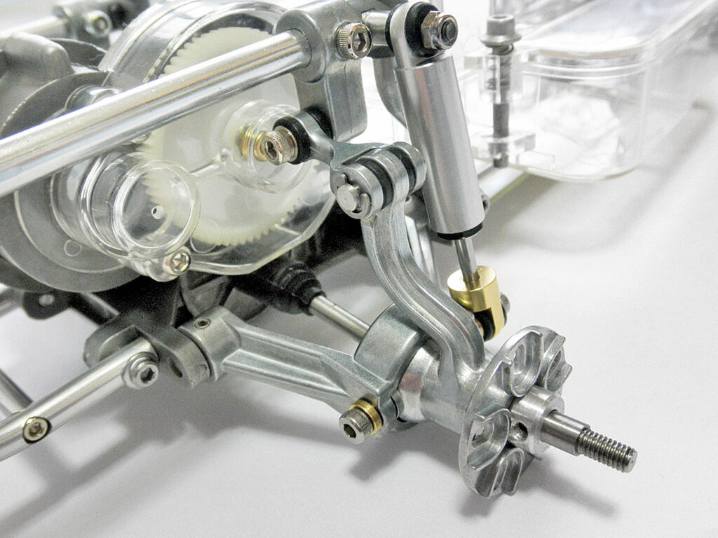 組むとこうなります。ロールバーやショックはノーマルを流用しますがサスアームやドライブシャフトはカスタム品が付属し、全て ボルトオンで組み立てられます(ショックは再販の新型に交換しました) 。コレ、30年前に「ダートバーナーズ」あたりから発売されてたらどんなプライスが付いたんでしょう? キット自体は加工精度も良く、特に問題なく組み立てられます。ただし2個必要な3mmEリングの替わりに、使わない4mmEリングが入ってたのはご愛嬌。