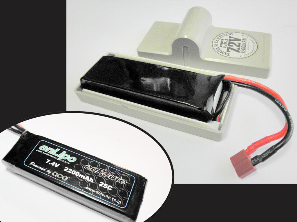 そこで、このラクダパックの中身を最新のリポにそっくり入れ替えてしまいます。(ただリポを積むだけじゃつまんないもんね♪) 純正のハードケースは強力な溶剤系接着剤でガッチリ固定されているので、Pカッターで丁寧に分割します。(内蔵のニッカドセルは絶縁処理をして「JBRC」の回収BOXへ)入れ替えるリポは寸法、容量が丁度いいエンルートの2セル・2200mAを用意します。R/C用リポ販売の老舗、エンルートのバッテリーは価格が手頃で重宝します。このスペックで2,100円。