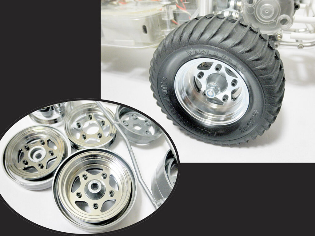 ここでブレードからアルミホイールの第2弾が発売されたのでさっそくGETしてみました。初期型の購入者が感じた不満ランキング(笑)1位の「オールアルミ化」と、同2位「表面仕上げ品質」が改善されて?、3ピース構造で表面処理はキレイなアルマイトになりました♪前回との価格差も大きくないので、こちらのタイプが絶対おススメ。渋いシルバーとハデなゴールドが選べますが、かつての京商やAYK用の「コンドルホイール」(古っ!)のイメージでゴールドアルマイトを購入♪・・・う~ん、シルバーの方が似合ってたか?