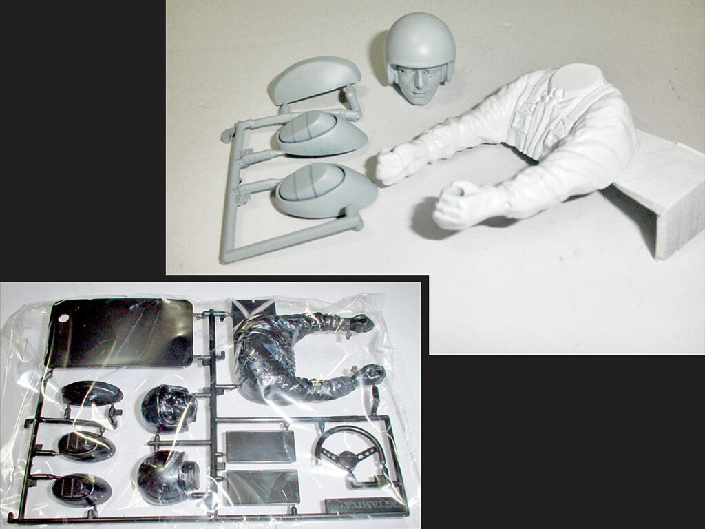 ところでこのボディー。当時モノなので細かな割れやキズ、塗装ハガレがあります。せっかくなのでこの機会に直します。そう言えばこの車、GETした時から何故かドライバー人形がありませんでした。パーツは用意してあるので塗装して取り付けましょう。ただ、コレ。再販の随分前に「モンビ」か「ブリビ」用を購入したので成型色が真っ黒!です。もぉ~っ、下地がめんどくさいって。