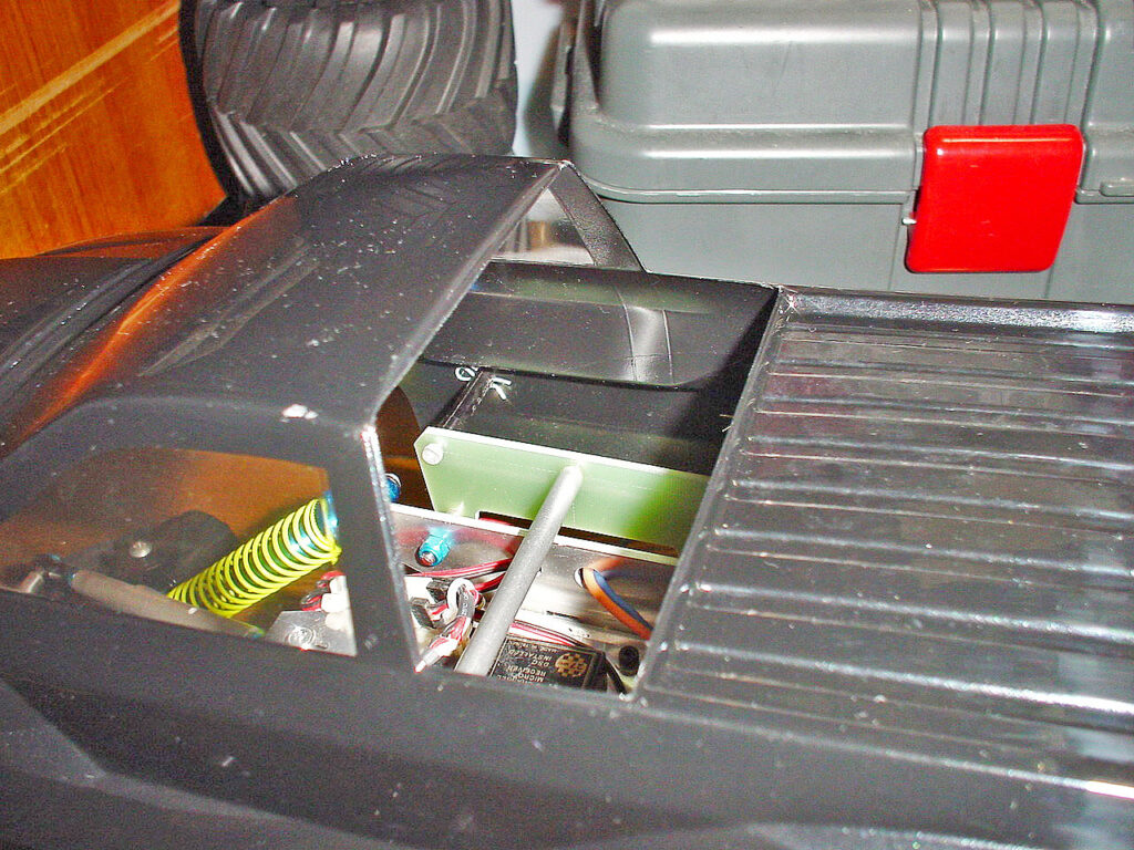 京商の2モーター用アンプ「パーフェックス」が欲しかったのですが見つからず、とりあえずジャンクBOXから入門用210CBを2個引っ張り出してフレーム両側に搭載。 前後モーターを独立してコントロールするためテキトーにシンクロさせて走行テスト待ち。 ワタシは自作する時、とりあえずショップへ行き、車以外のジャンルも含めて全てのパーツを眺めながらイメージに近い物を見つけていきます。
