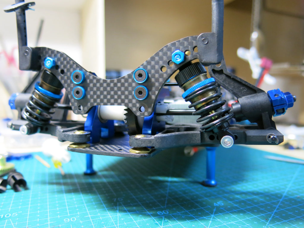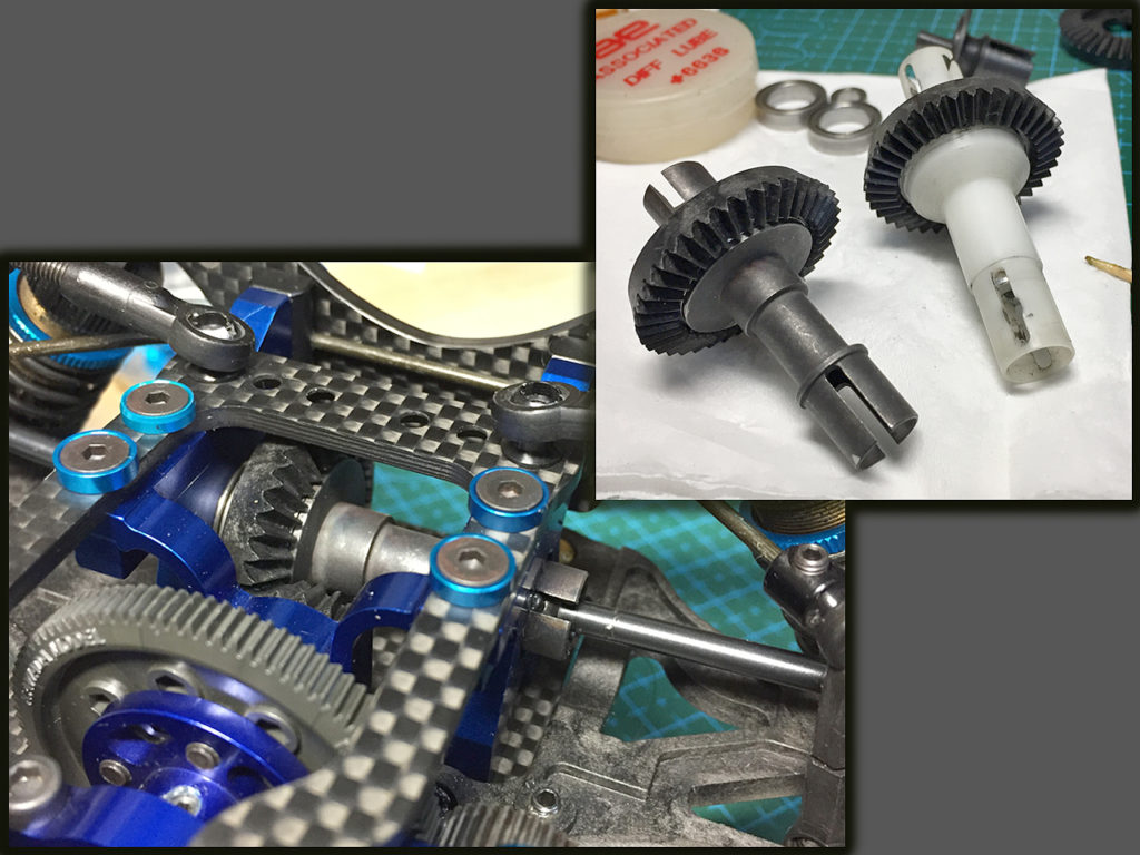 そうそう、ネジレシャーシのついでにタミヤのスーパーショートダンパーもジェネティックから移植してみました。前後ともダンパーステーのビス穴を開け直して8mmダウン。この効果もあってかインリフトすることなくコース全域で常に安定しています。3.5ターンブラシレス全開のストレートからのフルブレーキで、タイトコーナーの通過速度も確実に速くなって実に楽しいです♪ひさびさの絶好調で気を良くして、10周ほど走った時。「ボールデフが滑ってる?」