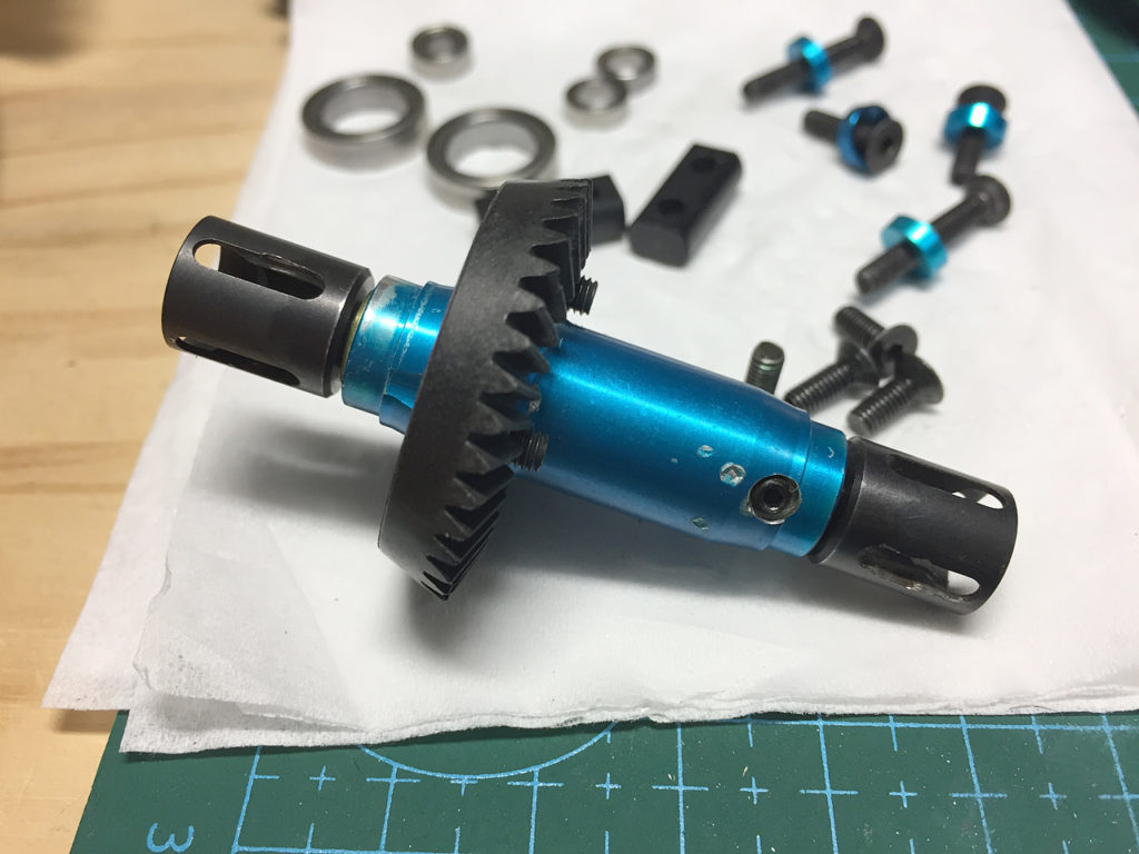 純正のワンウェイ用ドライブカップを装着してセットビスで固定すれば、フロント用のリジッドアクスルの完成です。そしていよいよリア用の「熔けない」ボールデフ、制作開始でふ!