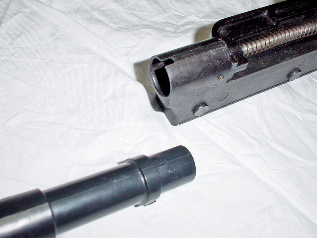 バレルはレシーバーに差し込んであるだけです。ストックから外しただけで前方に抜けます。(バレルもABS樹脂製です)