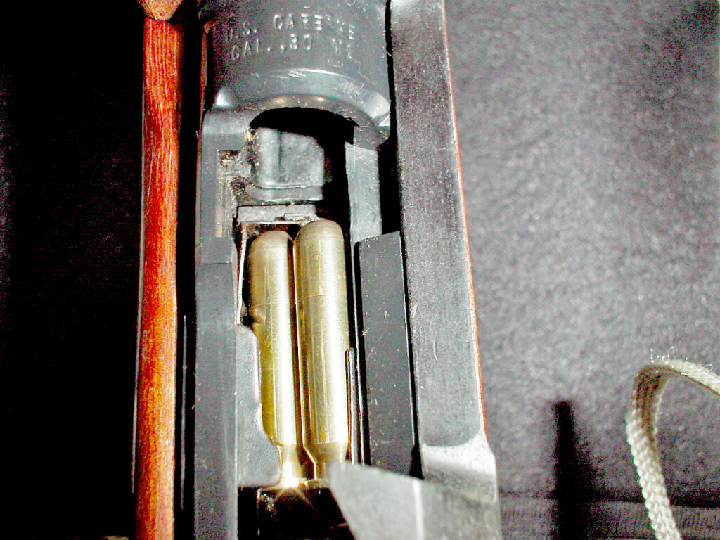 本体に装填するとこんな感じです。この眺めこそが、モデルガン最大の魅力でしょう。この後ボルトリリースを開放すればボルトの前進とともにカートリッジがチャンバーへ勢いよく送り込まれます。さらにキャップを入れて発火すればブローバックと同時に排莢という、「玩具銃」最大の見せ場へと続きます。そして何故か発火後には少々後悔します(笑)。