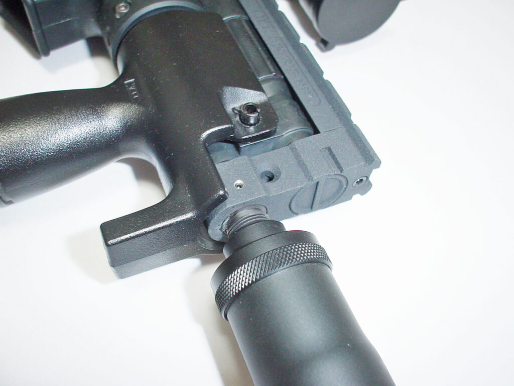 マズルパーツ下部に元々開いていた穴と合わせて3箇所でアダプターを固定します。 今後このアダプタ-を外す事も無いと思い、エポキシ接着剤も併用したので強度もバッチリです♪。