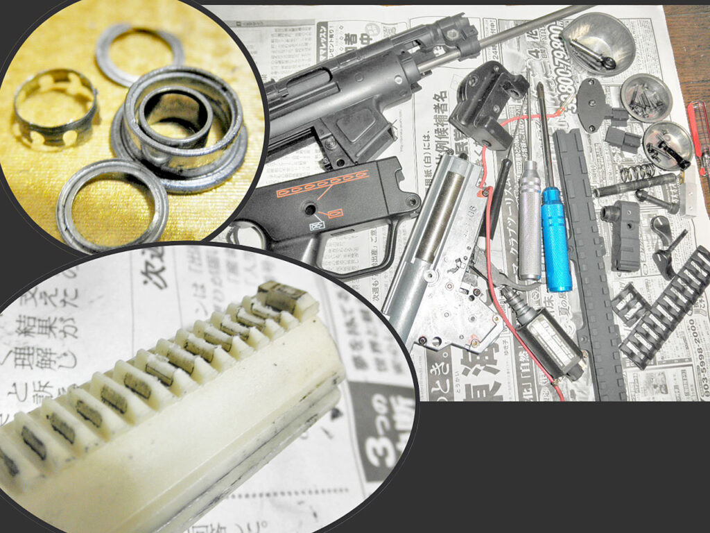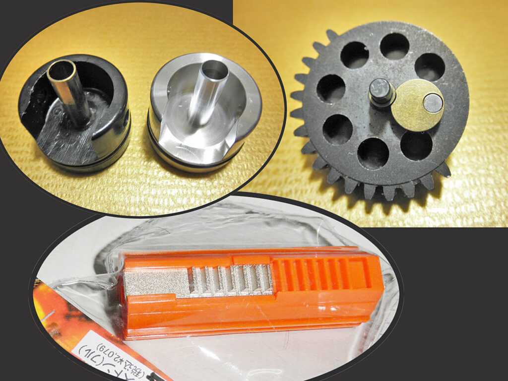 まぁせっかくなので、修理ついでにメンテと改良をしておきましょう。まず、ダメージを受けていそうな軸受けは6個全部を焼結メタルに交換します。3枚のギアは再びシステマの「ハイスピード」を組み込み、コレに合わせてスプリングもM90に戻します。ピストンは(イマイチ精度悪そうな)UFC製ハイスピード仕様に交換、ついでにシリンダーヘッドもシステマのラバー付きアルミに替えて作動音低減を狙います。これでまた初速が上がってしまいますが、今回はセクターギアの歯をカットしてストロークを調整してみます。さらに給弾を確実にする為に最近流行りのセクターチップを組んで対策します。