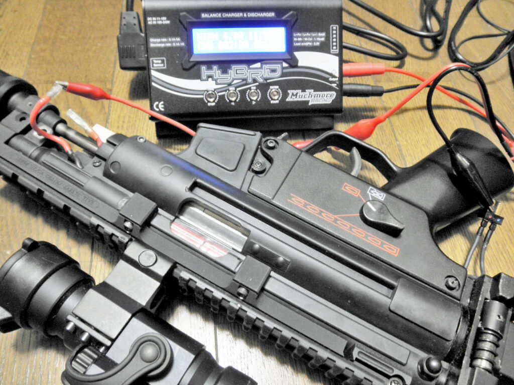 ヤレヤレ。 とりあえずメカBOXの調子が診たいので使えない中華電池を捨てて、配線し直します。別の8.4v,3,000mAバッテリーを接続。作動は快調。 いい感じの音ですが、パワーが気になります。ちなみにこのバッテリーもかなり劣化していて額面通りの容量が充電出来ません。それでもM90スプリングとハイスピードギアを軽々と回してしまいます。 やっぱり、大容量バッテリー(リポ?)を搭載した方が安定して使えそう・・・。 ちょっと考えてみますか。