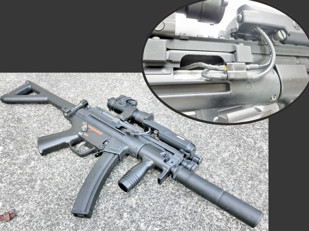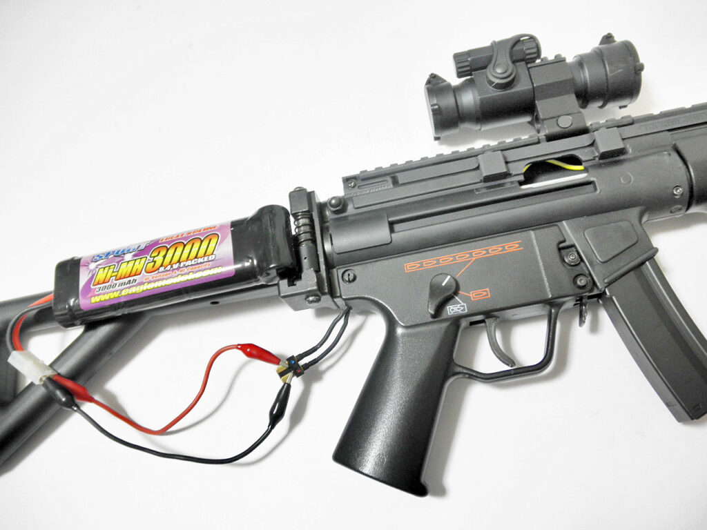これがリニューアル後のメインウェポンです。 14セルのNiMHから小型のリポに積み替えたので全体に軽くなって戦闘力アップ♪ バッテリーの出力コネクターの位置に合わせて、本体側のコネクターがエジェクションポートから出る様に配線し直しました。 ついでにムキ出しになるバッテリーの赤ワイヤーがカッコ悪いので、コネクター共々黒に統一しました。目立たないでしょ♪ 後はこの仕様でゲームに使って、バッテリー1パック当たりの発射可能弾数を確認すればOKです。