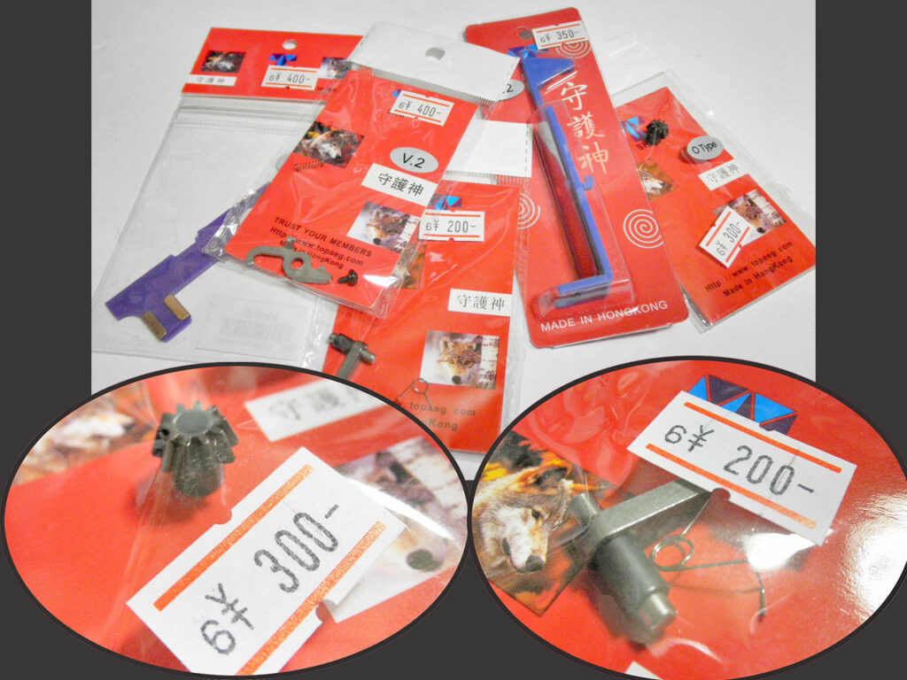 このGUN、使用頻度は少ないですが長年の使用でモーターピニオンの磨耗が激しいので交換します。交換用のパーツを買いに行ったアキバのエチゴヤでミョーな中華?ブランドを発見、その名も「守護神」。このメーカーのパーツ、値段にびっくり。モーター用ピニオンが300円!逆転防止ラッチなんて、たったの200円!うそ~っ?その心意気に惚れて、タペットプレートやセレクター、カットオフレバーも購入。この5点全部で1,650円、やすっ!ってか、これが本来の値段でしょ?。 次回のカスタムに、耐久実験も兼ねて一式まとめて投入してみますか。