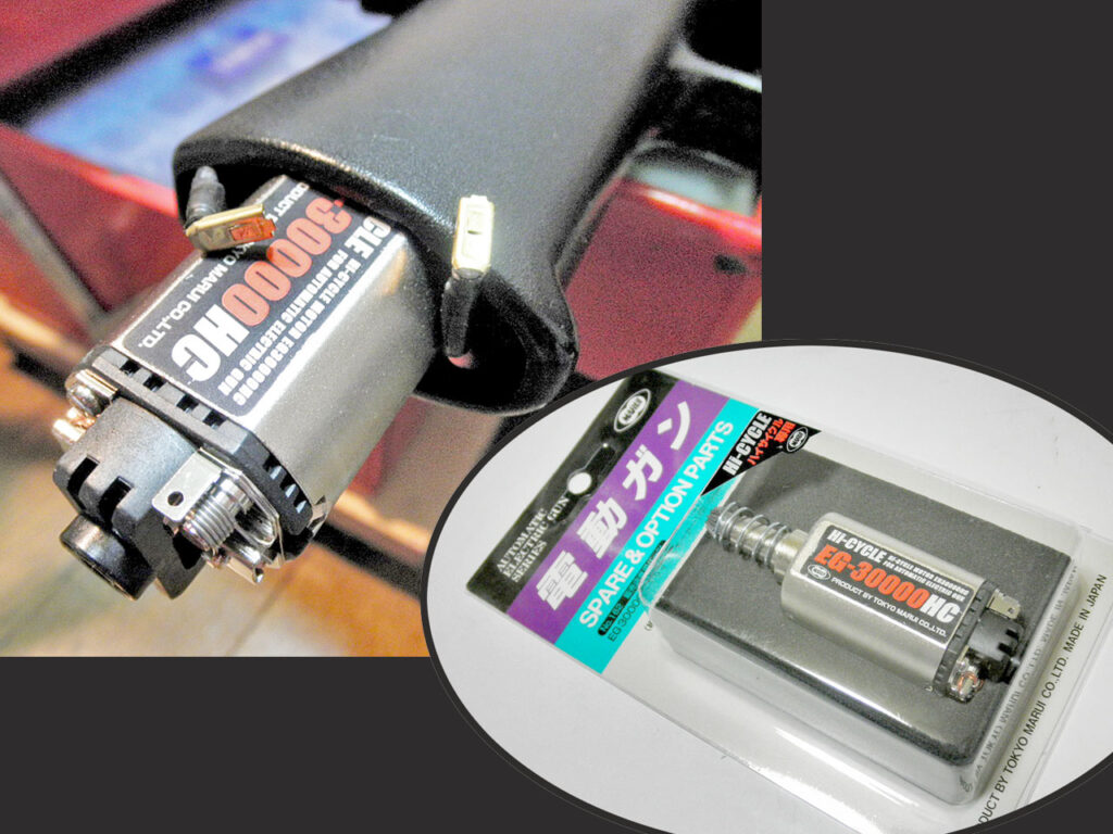 もともとこのGUNに付いていたモーターはEG700。発表当時は上級グレードという位置付けでしたが現在ではさらに高性能なモーターがいくつも登場しています。そこで、どーせならピニオンの交換ではなくモーターそのものを換装する事にしました。選んだのは「EG30000HC」。マルイ純正のハイサイクル専用高回転型です。もちろん無加工で装着出来るので、すぐに交換、調整して試射してみます。なるほど。確かに回転、あがってます♪体感的には、リポ化で電圧と共に落ちた回転の分はカバー出来ている感じです。
