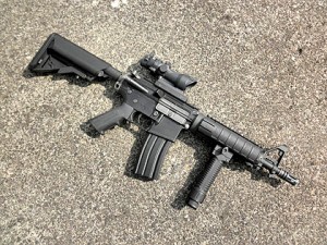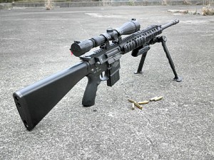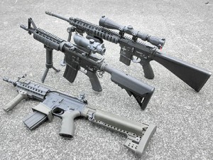 唯一のマルイ純正パーツ、固定ストックがテカテカに光っててビミョーですが、念願のフルサイズライフルがコレクションに加わりました。 記念に2挺のM4と並べて写真を♪重量はこの状態で約4,5kg。なんか、重い?