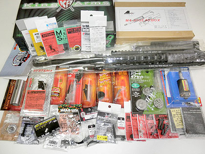 マルイの電動ガンはメカニズム的には既に完成していて寸法を含めた構造、パーツ形状等が電動ガンの「標準規格」として定着しています。様々なアフターパーツメーカーからも「マルイ互換」のパーツが山のように発売されています。 カスタムガンを目指すならアフターパーツを中心にして1挺組み上げた方が結果的に効率がイイのはタミヤの入門用ラジコンに似てます(笑)。コレは今回のスナイパーカスタム製作の為に用意したパーツです。