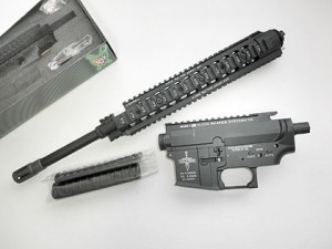 今回アッパーレシーバーは角ばったタイプにしたかったので、キングアームズの「VLTOR MUR-1」をチョイス。フロントキットはフルレングスURXと(もちろん)20inフローティングバレルの「ナイツ」タイプ、こちらはG&P製。ワタシはハンドガードをデルタリングで固定するのは嫌いなので、ネジ込み固定のコイツにしました。どちらも決して安くはないですが、昔「シェリフ」のガバ用削り出しフレームセットが高すぎて買えなかった事を思えば、まぁリーズナブルです。ただしどちらも鋳物なので切削品に比べるとエッジがかなり甘く、レシーバー表面には僅かに湯ジワも・・・。ストックは今の時点でどのタイプにするか決めてないので、じっくり選んでまた後で。
