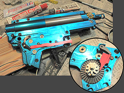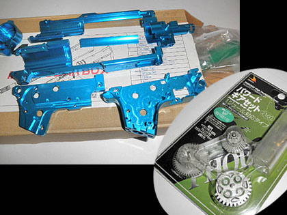 この2点が今回の目玉?パーツ。 台湾「PGC」製のアルミ削り出しメカボとフェニックスの「ハイプロテクションギア」のトルク型セットです。 ギアはPMCカスタムで実戦投入済みなので、今回も制式採用(笑)。 メカボはチャンバー一体の組み立て式で妙に精度がイイです。 完成後も上下レシーバーに組み付けたまま分離出来る(!)そうです。