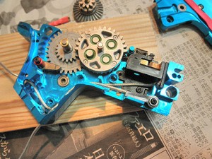 で、またまたバラして調整とパーツ交換を。まずはトリガーから。SEMIポジションではギアのカムと連動したカットオフレバーによってスイッチブロックが持ち上げられてトリガーから外れます。この時、トリガー上端の爪部分がブロックの底に引っ掛かって戻りが悪くなるようです。なのでこのトリガーの爪を、スムーズに戻るようになるまで慎重に削ります。仮組みしてモーターを装着、動作確認してみます。セミオートのキレ、トリガーの戻り共に良くなりました♪因みにモーターはメタル軸受けのイーグル「HUMMER1000」、グリップエンドはシステマのローノイズタイプ。