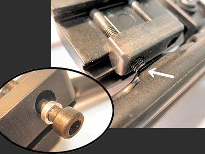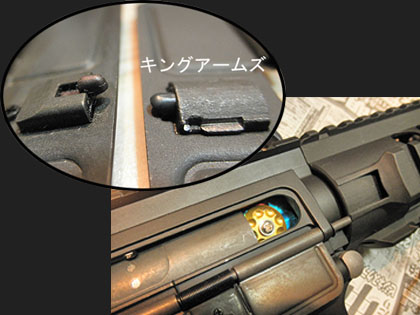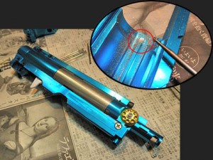 さらにこのメカボの最大のウリ、「セパレート構造」によってポンプユニット側のスプリングやピストンは完成後も簡単に取り出し&交換が出来ます。メカボのテイクダウンなんて必要か?って思ってましたが、今回の様に初速の調整で何度もバラす時には確かに便利です♪ただ。キングアームズのレシーバー内側にはマルイ純正には無い独自のギミックが付いていて、このギアボックスだとココが干渉してしまいます。 コイツは、ホップ調整時に後方でロックしたプレート状のダミーボルトをボルトリリースと連動して閉鎖できる仕掛けです。