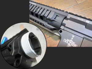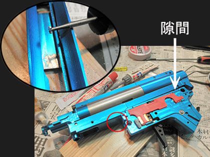 ここでフロントキットとインナーバレルも組み付けます。メーカーが違うのでレシーバーとバレル固定リングの接合部のネジサイズの相性がイマイチです。妙に緩くて、強く締め込むとバカになりそうなのでオス側に配管用のシーリングテープを2回ほど巻いておきます。(エアータンク時代みたいで、なんか懐かしいです♪)バレル固定後URXとレシーバーそれぞれの上面レールがピッタリ合うように慎重に締め込みます。また、ガスパイプ(ステンレス棒)を差し込む穴もズレているので棒の先端を削って調整します。ピカティニー規格のはずのレール幅も、両者でビミョーに違います。まぁ、「オモチャ」のアフターパーツなんてこんなモノか?