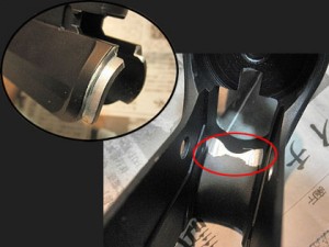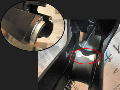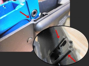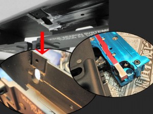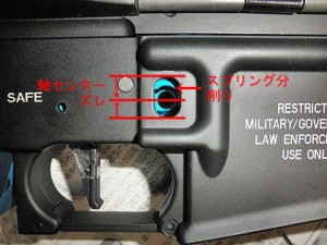 このギミックが無くなってしまうのは残念ですがギアボックスが納まらなければ始まらないので、リューターで削り取ってしまいます。写真では後ろ側の出っ張りだけを削ってますがメカボックスのアッパーも干渉するので、前側の出っ張りも削りました。これでギアボックス自体はレシーバーに納まりましたが例のラッチリリースのレバーが全力で干渉してます。さらに削るにしても量が多いので、とりあえずここではレバーを外して先へ進みます。