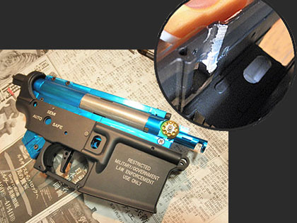 メカボを組み込んだ状態で上下レシーバーを合わせるとかなりキツくなります。ロアレシーバー後端内側、ワイヤーの通路部分にある角をリューターで削りメカボとのクリアランスを拡げます。 さらにアッパー後端、上下レシーバーの勘合部分もキツ過ぎるので一回り削っておきます。これでひとまず、メカボックスがレシーバーに納まりました♪
