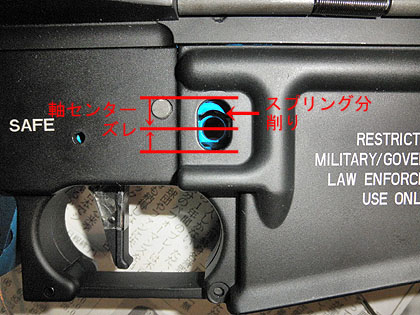 ただ。前後テイクダウンピンやトリガーピンの穴位置はほぼピッタリ合うようになりましたが、マガジンキャッチ用の軸穴位置がかなり下にズレてます。さらにこの部分のメカボ形状がややタイトでマグキャッチのリターンスプリングのクリアランスが足りません。そこで、まずそのクリアランスを確保する為にメカボの一部を軸穴より一回り大きく削っておきます。全てパーツから組むフルカスタムなので覚悟はしてましたがメーカー毎の相性の悪さが予想以上に大きいです。が、まぁその調整も楽しみのうちだと割り切って進めましょう♪