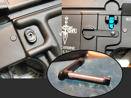 このメカボの売りのひとつ、分解時に逆転防止ラッチの解除を外部からワンタッチで出来る仕掛けです。マガジンハウジング内側からメカボ右側の赤いレバーを押し込むと、複雑なリンクを介してラッチを押し下げ解除します。リンクやスライダーはアルミ削り出しでアルマイト処理済み。まぁ、よく設計したもんだ。 トリガーはライラクスのアジャスタブルタイプを装着。