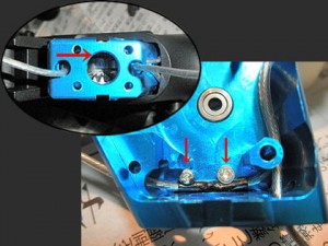 この時メカボを取り出したついでに、この部分に細工をしておきます。 スペースの関係で、スイッチからくるワイヤーの一本がモーターピニオン用軸穴の脇を通ります。 これが穴にハミ出すとモーターを着脱する時にピニオンギアのエッジに引っ掛けて傷付けたり、モーターが抜けなくなったりします。そこでメカボのワイヤー通路に穴を開けて2mmのタップを立てます。ここにビスをネジ込んで、その頭でワイヤーを壁際に固定してしまいます。これで穴からワイヤーが覗く事はありません♪