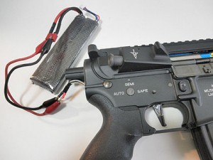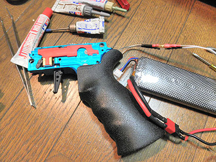 ここまで出来たところで一旦全てを組み付けて、作動確認してみます。まだストックがないので電源用ワイヤーに直接リポバッテリー(7,4v/3,200mh)を繫ぎます。まずはAUTOポジションでトリガー(スイッチ)ON。トルクギアなのでサイクルはゆっくりですが軽快に作動しています。が。トリガーストッパー(セイフティーレバー)の動きが渋くて戻りが悪く、セレクターを一度SAFEポジションに入れてしまうと2度とトリガーを引けなくなってしまいます。セミオートのキレもイマイチです。再度バラして調整します。
