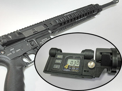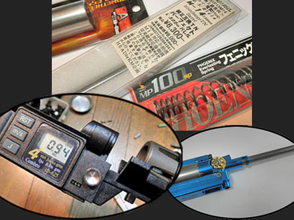 次にポンプ系のパーツを交換します。ステンレスのフルサイズシリンダーとM100スプリングは どちらもライラクス製。バレルは最近話題の「参式滑空銃身」も含めていろいろ迷いましたが、結局いつもの「TNパーフェクトバレル」の500mmをチョイス。このスペックで組み上げて再度出力測定してみると0,9~0,94J♪ この数値なら、環境の変化で多少変動しても規定値を超える事は無いでしょう。これで、ようやく中身は完成です。