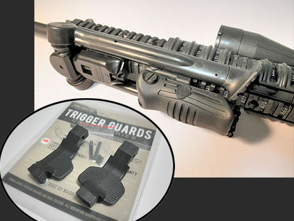 このG&Pのフォールディンググリップは構造上やや幅があり、畳んだ足のガタを押さえるのに丁度いいサイズです♪同一メーカーなのでレールとの相性もバッチリです。さらに最近流行り(?)のポリマー製フィンガーレスト付きトリガーガードを装着。スコープは対物レンズ50mmでフード付きのゴツいタイプを新調したいんですが、さすがにもう予算オーバー!です。まぁ、手持ちのタスコズームスコープでも機能は十分なのでとりあえずこの仕様で試射してみます。